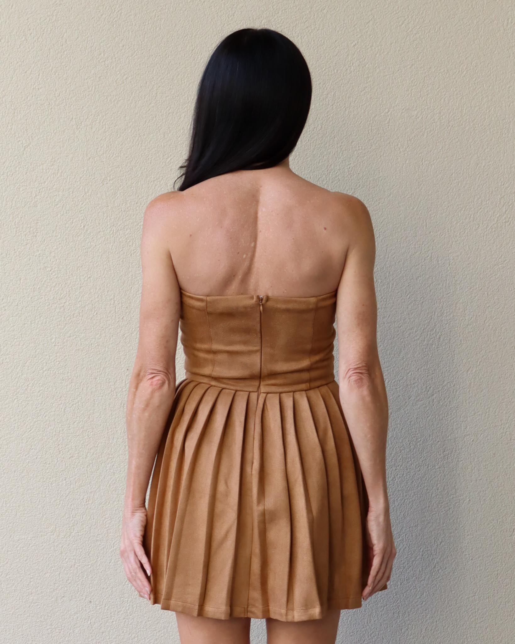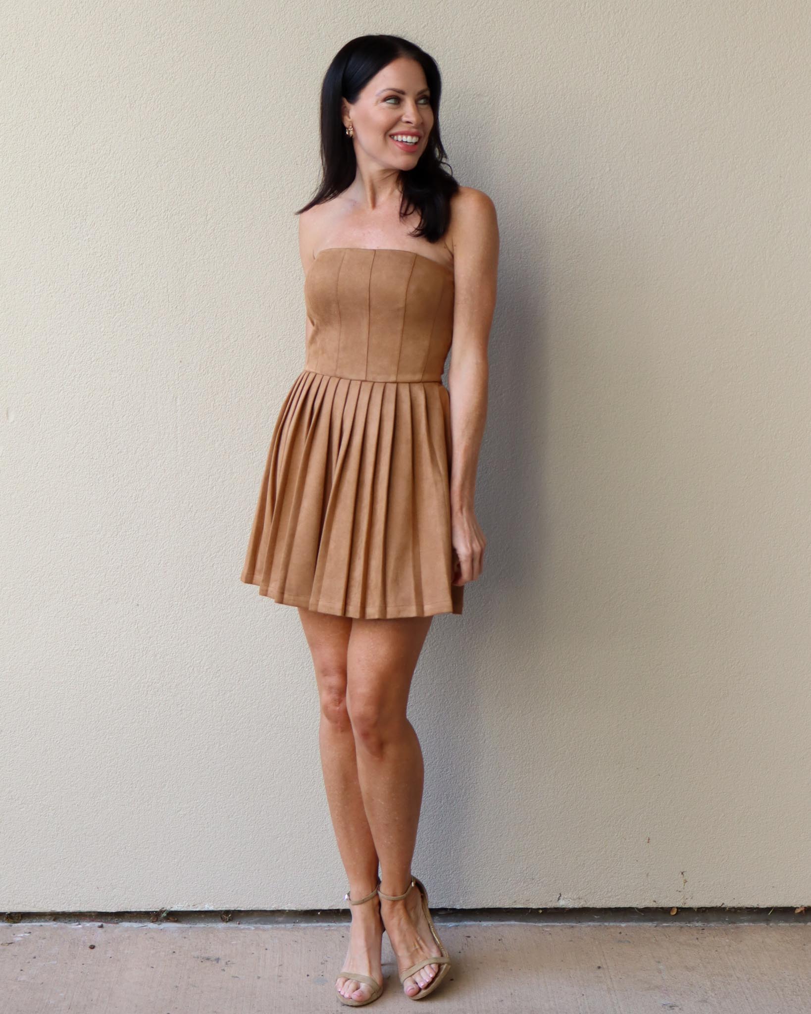 This strapless Kasey Sueded Pleated Mini Dress is your go-to for effortless style. Perfect alone or layered under a cozy sweater or jacket, it easily transitions. The soft suede feel and playful pleats add a flirty touch, making it a versatile piece that keeps your look fresh all season long.