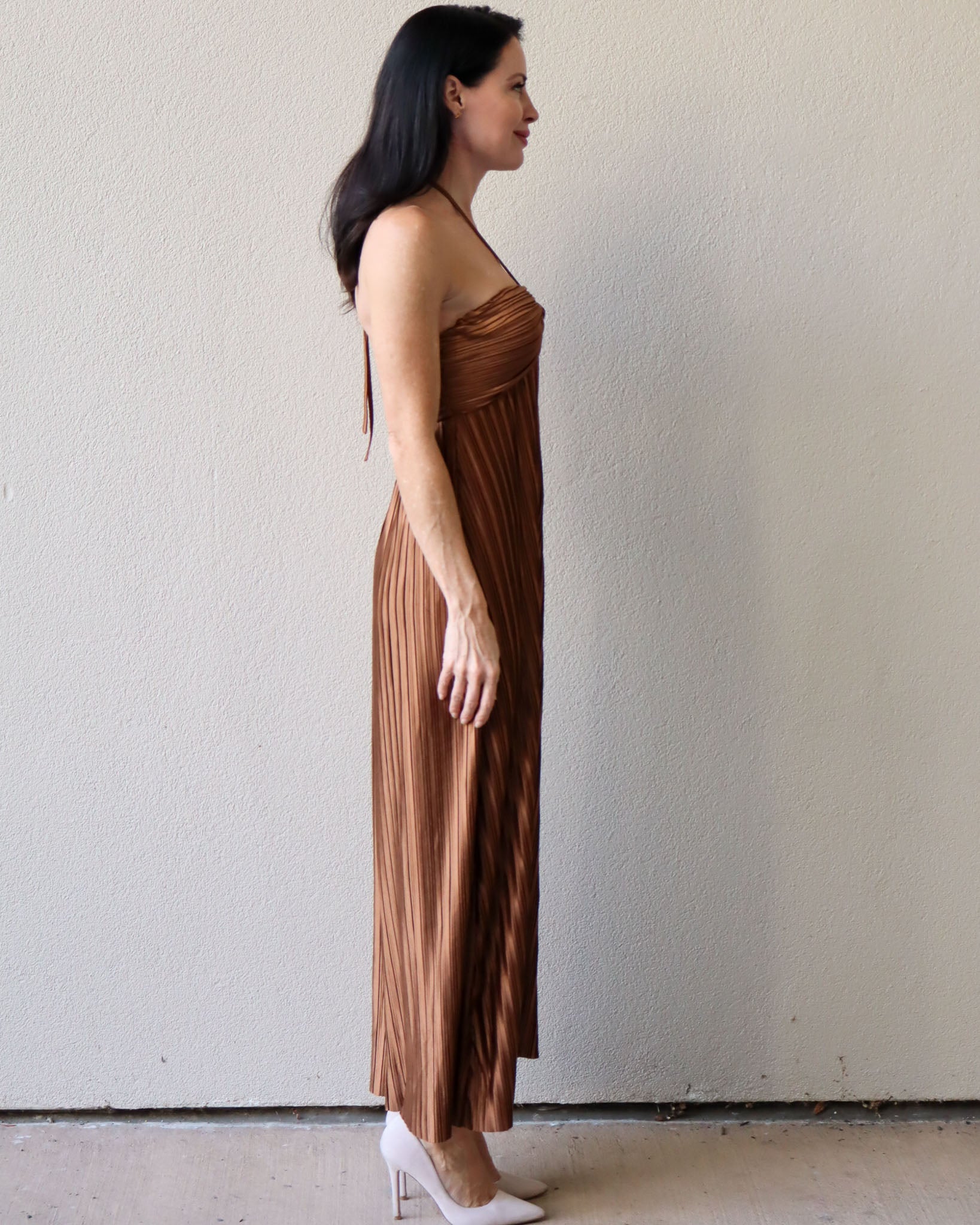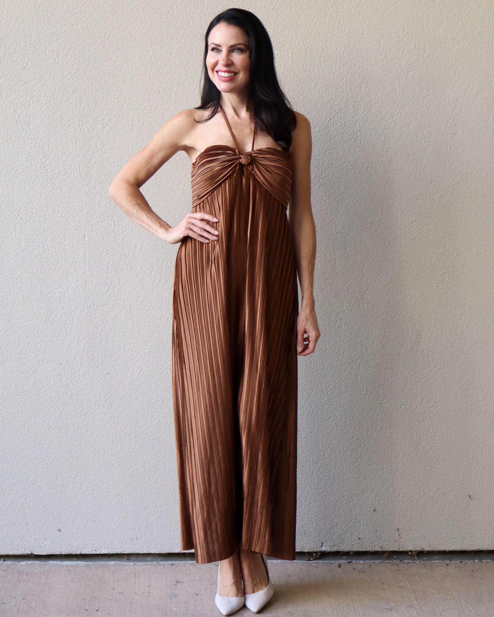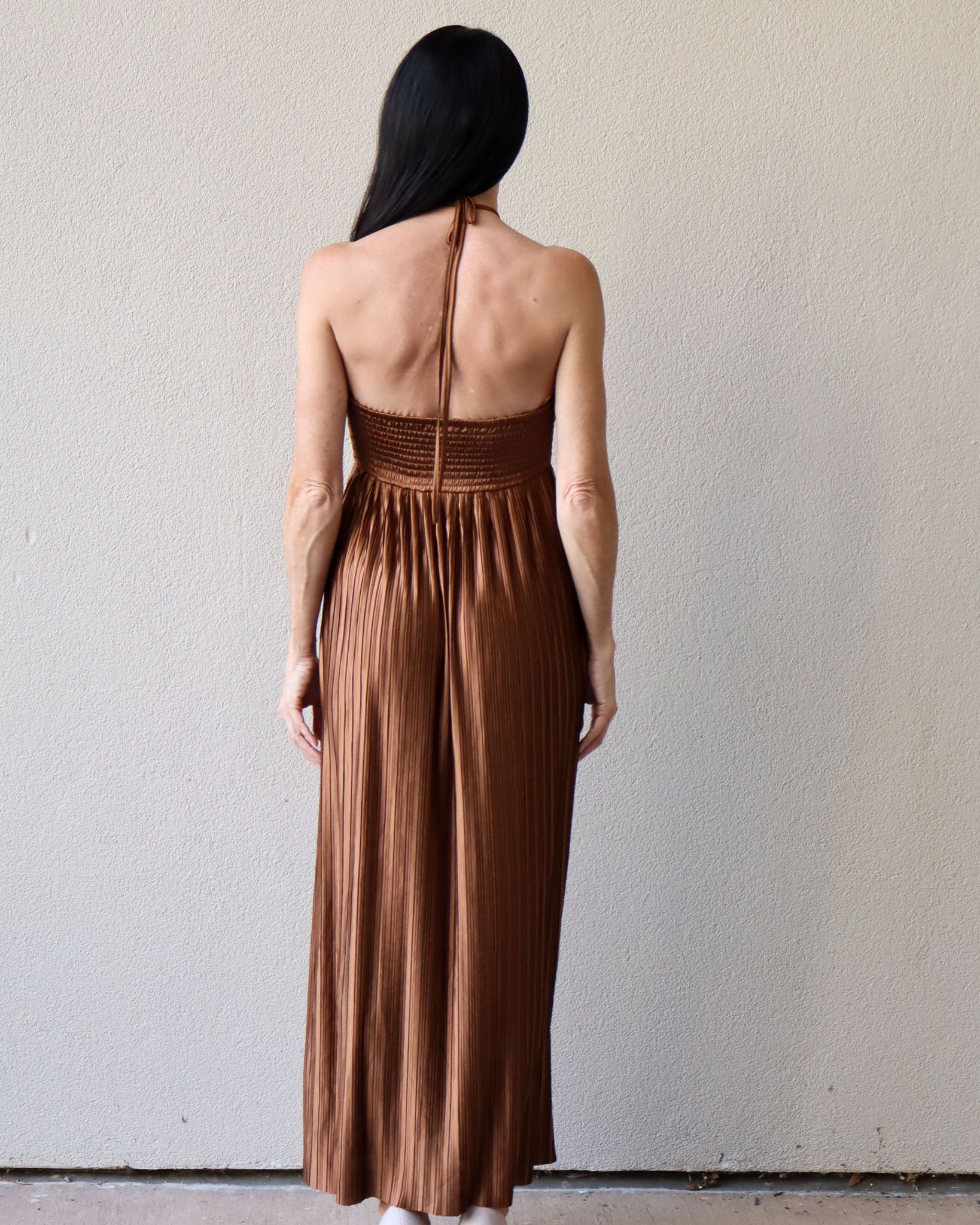 Step into style with the Addy Pleated Maxi Dress—your perfect pick for wedding guest glam, fall events, or a dreamy date night. Its rich brown hue adds warmth and depth, while the flowing pleats bring a playful sway to every step. Dress it up or dress it down by tossing on a denim jacket and sneakers for an effortlessly chic, casual look.
