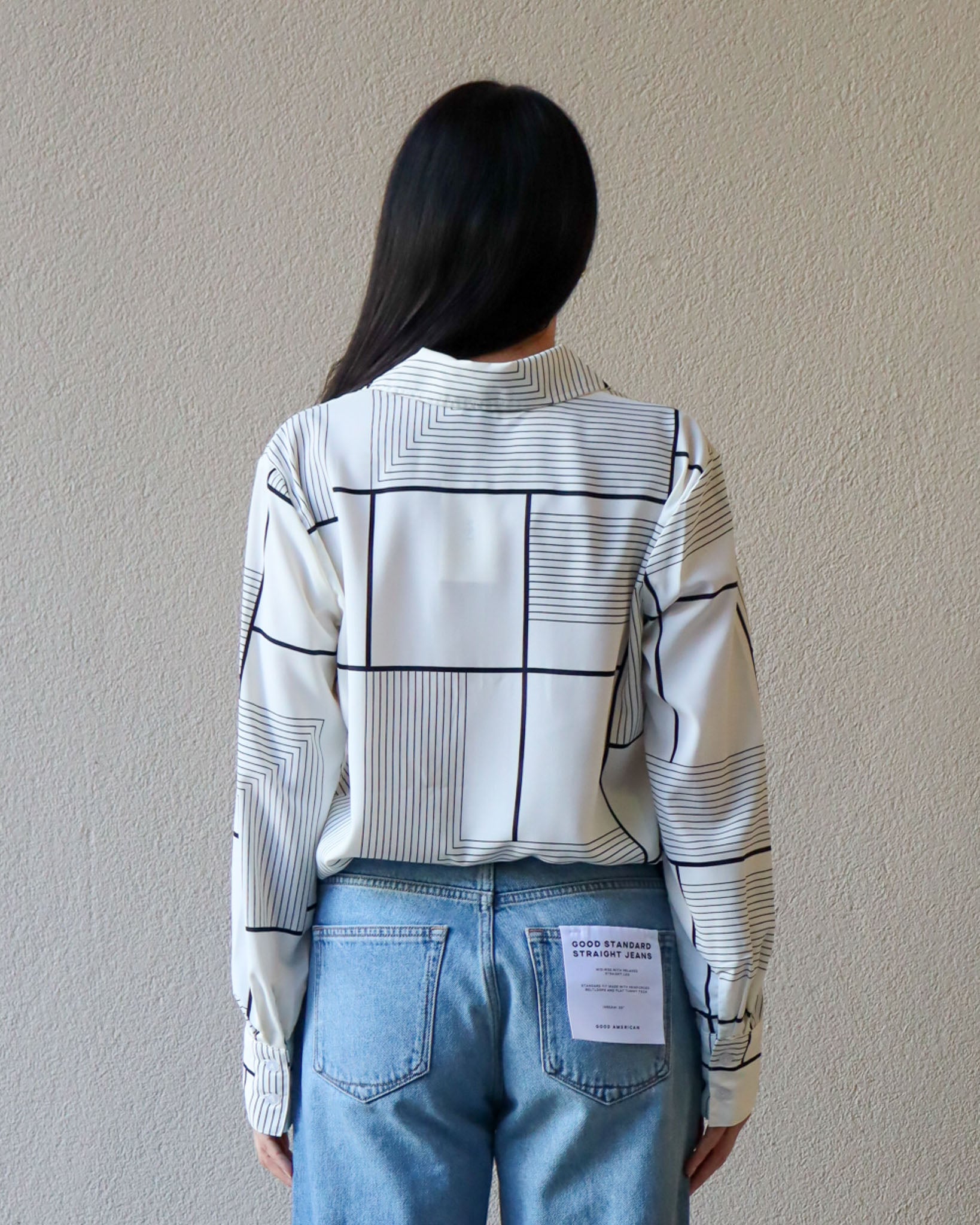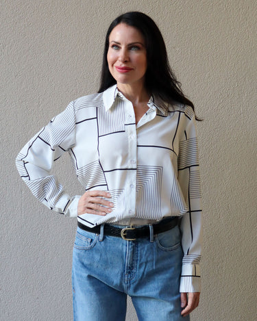The Shanna Geo Pattern Button Up Blouse is your new go-to for work wear with a twist. Its playful geometric print adds a pop of personality while layering effortlessly for those in-between seasons. Perfect as a transitional staple, this blouse keeps you stylish and ready for whatever the day brings—whether at the office or out and about.